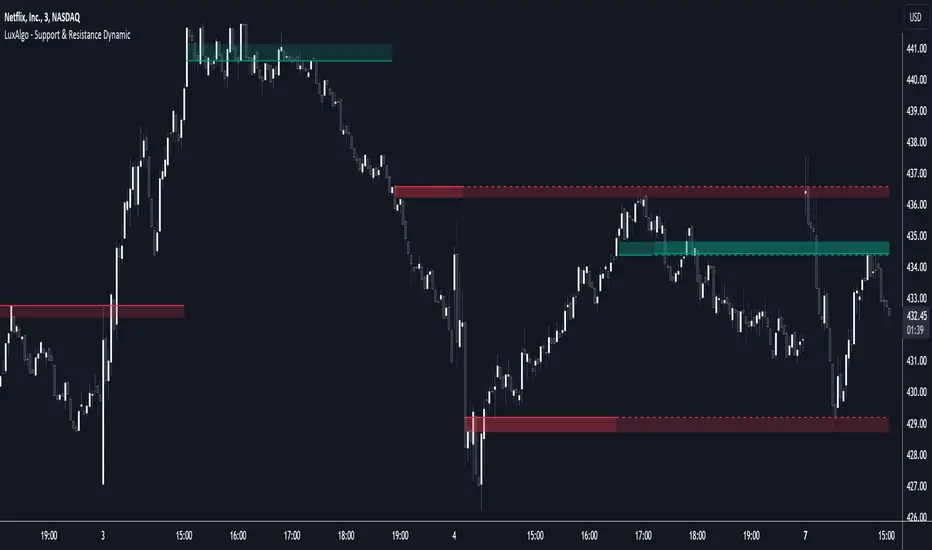 The Support & Resistance Dynamic indicator aims to return real-time predictive support and resistance zones that are relevant to a detected trend. This makes this indicator similar to our previously published Predictive Ranges indicator.