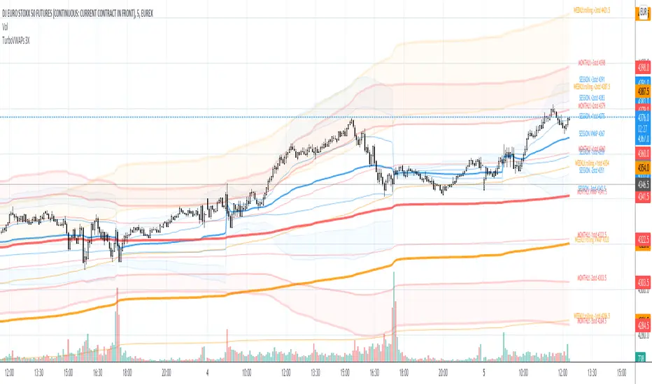 Each VWAP can be configured to be a Rolling or Anchored VWAP and to automatically adapt its period depending on the current chart timeframe. For example, you can configure each VWAP to be a rolling 30min VWAP for timeframes below 30M, a session-anchored VWAP between 30M and 1D timeframes, a rolling monthly VWAP for a 1D timeframe and a quarterly VWAP for a weekly timeframe.