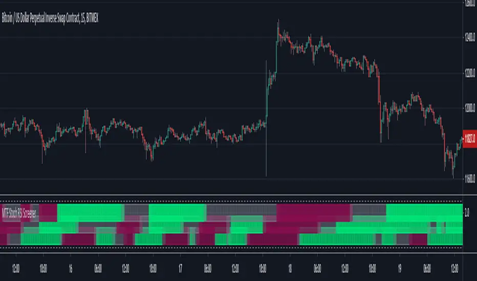 Displays when multiple timeframes of Stochastic RSI are overbought/oversold. Multiple consecutive timeframes being overbought/oversold can signify a short term top or bottom.