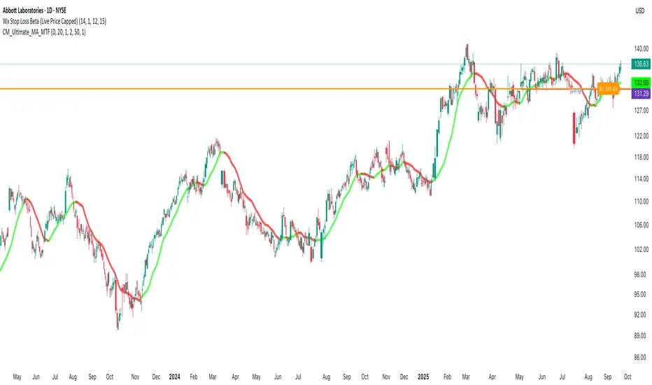 Wx Stop Loss Beta (Live Price Capped)Adaptive, trail-up-only stop-loss overlay. The script computes a base stop each bar and then trails it upward using a persistent series so the stop never decreases.