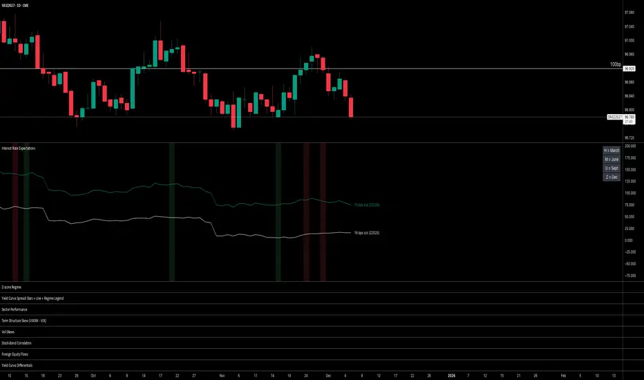 This indicator shows how much rate cuts or hikes are currently priced into SOFR futures. You choose two SOFR contracts and the script converts each contract price into basis points relative to the current effective fed funds rate. This gives you a very clear view of how policy expectations shift over time.