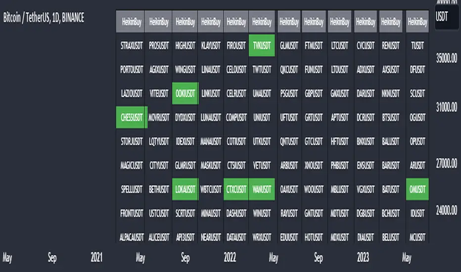 With the indicator, a maximum of 30 symbols can be listed at once. However, this number can be increased according to your tradingview membership type. Especially if you are a premium member of tradingview, you can add as many indicators as you want to the chart without any limitation, and you can add as many symbols as your screen width to the chart. Heikin Ashi Master Buy signals you can see on a single screen.