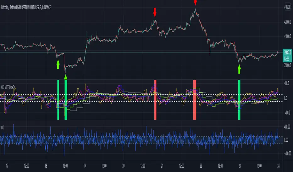 This is a simple Commodity Channel Index (CCI) indicator with multi-timeframe (MTF) overbought and oversold level.