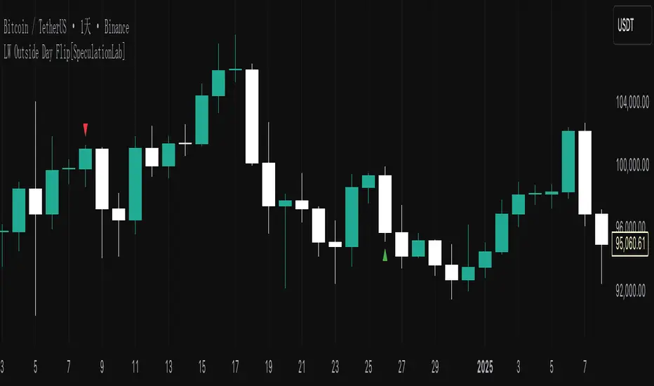 本指标用于在图表上标记一种经典的“外包线 + 极端收盘”的价格行为形态。思路参考 Larry Williams 在《Long-Term Secrets to Short-Term Trading》(第二版,第七章)中对日线“Outside Day”与反向收盘的讨论。指标不包含交易执行或提醒功能,仅在满足条件时绘制信号标记,用于辅助研究。
