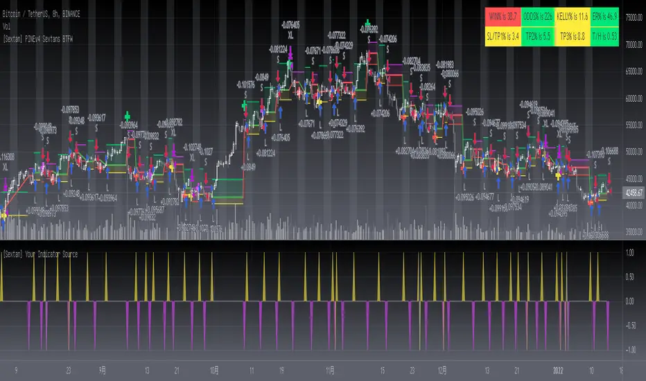 The second layer: "{Sextan} PINEv4 Sextans Backtest Framework". This script is the standardized trading system strategy execution and alarm, used to generate the final report of the strategy backtest and some key indicators that I have customized that I find useful, such as: winning rate , Odds, Winning Surface, Kelly Ratio, Take Profit and Stop Loss Thresholds, Trading Frequency, etc. are evaluated according to the Kelly formula. To use the second layer, first load it into the TrainingView chart, no markers will appear on the chart, since you have not specified any strategy source signals, click on the gear-shaped setting next to the "{Sextan} PINEv4 Sextans BTFW" header button, you can open the backtest settings, the first item is to select your custom strategy source. Because we have added the strategy source to the chart in the previous step, you can easily find an option "{Sextan} Your Indicator Source: Signal" at the bottom of the list, this is the strategy source input we need, select and confirm , you can see various markers on the main graph, and quickly generate a backtesting profit graph and a list of backtesting reports. You can generate files and download the backtesting reports locally. You can also click the gear on the backtest chart interface to customize some conditions of the backtest, including: initial capital amount, currency type, percentage of each order placed, amount of pyramid additions, commission fees, slippage, etc. configuration. Note: The configuration in the interface dialog overrides the same configuration implemented by the code in the backtest script.