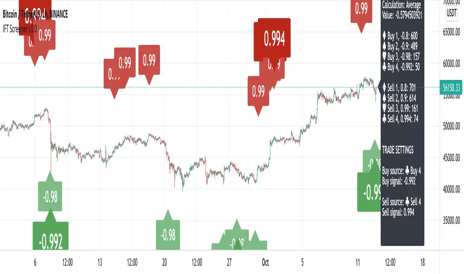 With this indicator you're able to visually review the signal strength of one or multiple oscillators processed with Inverse Fisher Transform ( IFT ), combine them and choose the method of calculation when they are combined. This produces a signal which strongly fluctuates between -1 and +1 instead of the more common 0-100 most oscillators uses. The intention is to make the decision making clearer and easier when you decide when to enter or exit a trade. This aims to help you remove the feelings from your trading.