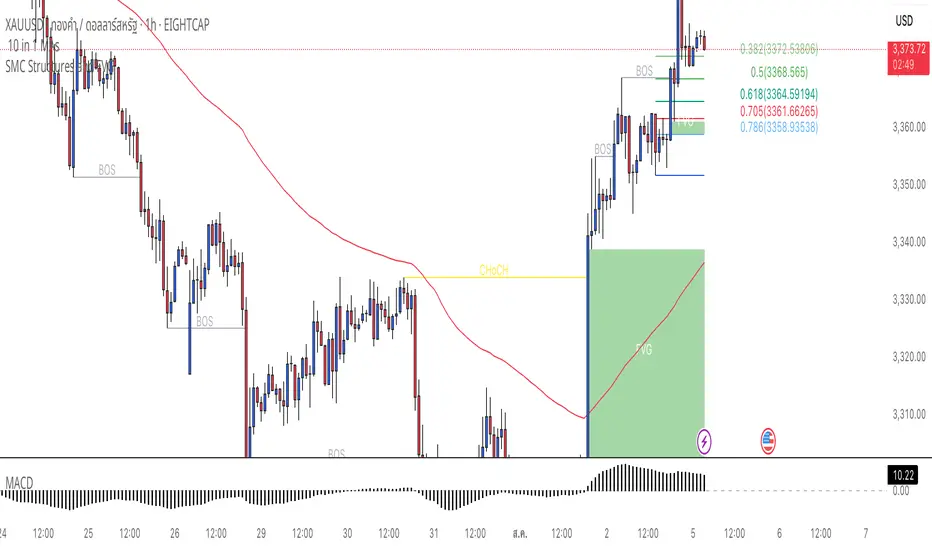 Hello! I will explain the "SMC Structures and FVG + MACD" indicator you provided in detail, section by section, so you can fully understand how it works.This indicator combines the concepts of Smart Money Concept (SMC), which focuses on analyzing Market Structure and Fair Value Gaps (FVG), with the MACD indicator to serve as a filter or confirmation for Choch (Change of Character) and BoS (Break of Structure) signals.1. Overall PurposeThe main purposes of this indicator are:Identify Market Structure: Automatically draw lines and label Choch (Change of Character) and BoS (Break of Structure) on the chart.Integrate MACD Confirmation: Choch/BoS signals will only be considered when the MACD Histogram performs a cross (Zero Cross) in the corresponding direction.Display Fair Value Gap (FVG): If enabled, FVG boxes will be drawn on the chart.Display Fibonacci Levels: Calculate and display important Fibonacci levels based on the current market structure.Adapt to Timeframe: All calculations and displays will automatically adjust to the timeframe you are currently using.2. Code BreakdownThis code can be divided into the following main sections:2.1 Inputs (Settings)This section contains variables that you can adjust in the indicator's settings window (click the gear icon next to the indicator's name on the chart).MACD Settings:fast_len: Length of the Fast EMA for MACD (default 12)slow_len: Length of the Slow EMA for MACD (default 26)signal_len: Length of the Signal Line for MACD (default 9)[macd_line, signal_line, hist] = ta.macd(close, fast_len, slow_len, signal_len): Calculates the MACD Line, Signal Line, and Histogram using the closing price (close) and the specified lengths.is_bullish_macd_cross: Checks if the MACD Histogram crosses above the 0 line (from negative to positive).is_bearish_macd_cross: Checks if the MACD Histogram crosses below the 0 line (from positive to negative).Fear Value Gap (FVG) Settings:isFvgToShow: (Boolean) Enables/disables the display of FVG on the chart.bullishFvgColor: Color for Bullish FVG.bearishFvgColor: Color for Bearish FVG.mitigatedFvgColor: Color for FVG that has been mitigated.fvgHistoryNbr: Number of historical FVG to display.isMitigatedFvgToReduce: (Boolean) Enables/disables reducing the size of FVG when mitigated.Structures (โครงสร้างตลาด) Settings:isStructBodyCandleBreak: (Boolean) If true, the break must occur with the candle body closing above/below the Swing High/Low. If false, a wick break is sufficient.isCurrentStructToShow: (Boolean) Enables/disables the display of the current market structure lines (blue lines in the example image).pivot_len: Lookback length for identifying Pivot points (Swing High/Low). A smaller value captures smaller, more frequent swings; a larger value captures larger, more significant swings.bullishBosColor, bearishBosColor: Colors for bullish/bearish BOS lines and labels.bosLineStyleOption, bosLineWidth: Style (Solid, Dotted, Dashed) and width of BOS lines.bullishChochColor, bearishChochColor: Colors for bullish/bearish CHoCH lines and labels.chochLineStyleOption, chochLineWidth: Style (Solid, Dotted, Dashed) and width of CHoCH lines.currentStructColor, currentStructLineStyleOption, currentStructLineWidth: Color, style, and width of the current market structure lines.structHistoryNbr: Number of historical breaks (Choch/BoS) to display.Structure Fibonacci (from original code):A set of inputs to enable/disable, define values, colors, styles, and widths for various Fibonacci Levels (0.786, 0.705, 0.618, 0.5, 0.382) that will be calculated from the current market structure.2.2 Helper FunctionsgetLineStyle(lineOption): This function converts the selected string input (e.g., "─", "┈", "╌") into a line.style_ format understood by Pine Script.get_structure_highest_bar(lookback): This function attempts to find the Bar Index of the Swing High within the specified lookback period.get_structure_lowest_bar(lookback): This function attempts to find the Bar Index of the Swing Low within the specified lookback period.is_structure_high_broken(...): This function checks if the current price has broken above _structureHigh (Swing High), considering _highStructBreakPrice (closing price or high price depending on isStructBodyCandleBreak setting).FVGDraw(...): This function takes arrays of FVG Boxes, Types, Mitigation Status, and Labels to process and update the status of FVG (e.g., whether it's mitigated) and adjust the size/position of FVG Boxes and Labels on the chart.2.3 Global VariablesThese are variables declared with var, meaning their values are stored and updated on each bar (persists across bars).structureLines, structureLabels: Arrays to store line and label objects for Choch/BoS lines drawn on the chart.fvgBoxes, fvgTypes, fvgLabels, isFvgMitigated: Arrays to store FVG box data and their respective statuses.structureHigh, structureLow: Stores the price of the significant Swing High/Low of the current market structure.structureHighStartIndex, structureLowStartIndex: Stores the Bar Index of the start point of the significant Swing High/Low.structureDirection: Stores the status of the market structure direction (1 = Bullish, 2 = Bearish, 0 = Undefined).fiboXPrice, fiboXStartIndex, fiboXLine, fiboXLabel: Variables to store data and objects for Fibonacci Levels.isBOSAlert, isCHOCHAlert: (Boolean) Used to trigger alerts in TradingView (if alerts are configured).2.4 FVG ProcessingThis section checks the conditions for FVG formation (Bullish FVG: high[3] < low[1], Bearish FVG: low[3] > high[1]).If FVG occurs and isFvgToShow is true, a new box and label are created to display the FVG on the chart.fvgBoxes and fvgLabels are managed to limit the number of FVG displayed according to fvgHistoryNbr and remove older FVG.The FVGDraw function is called to update the FVG status (e.g., whether it's mitigated) and adjust its display.2.5 Structures ProcessingInitialization: At bar_index == 0 (the first bar of the chart), str