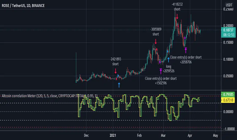 Hereby a script where the relative strength of an (in this case) altcoin is measured. The script produces a correlation between the altcoin and total altcoin market (Total2 index, see script). Using this script you can see when there is a strong correlation between the two and when there isn't. Moreover, it also produces long/short signals using hull moving average crossover.