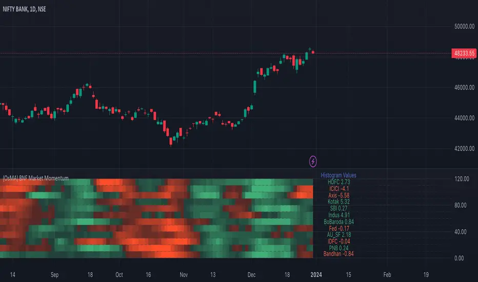 This indicator is the market breadth for Bank Nifty (NSE:BANKNIFTY) index calculated on the histogram values of MACD indicator. Each row in this indicator is a representation of the histogram values of the individual stock that make up Bank Nifty. Components are listed in order of its weightage to Bank nifty index (Highest -> Lowest).