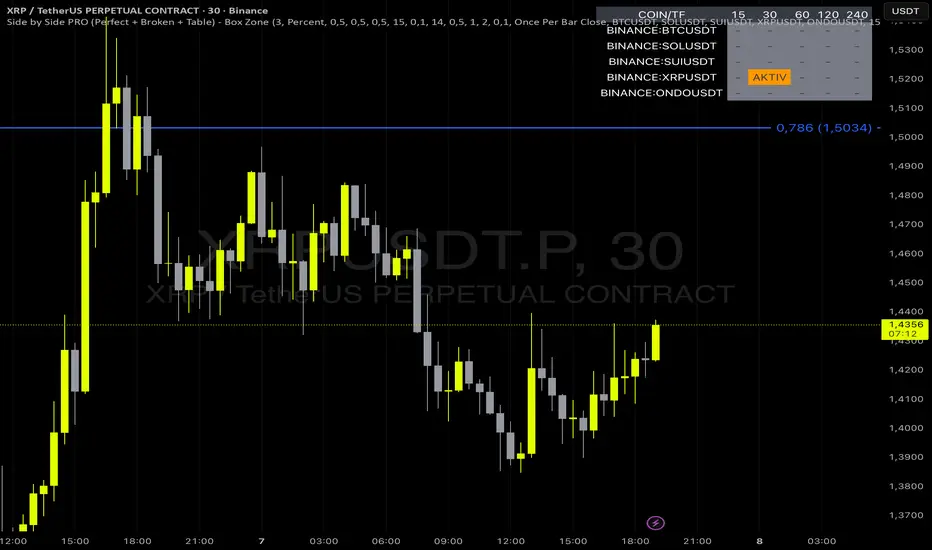 Side by Side PRO spots price clusters where candles close at similar levels. It draws a zone box on the chart and signals when price breaks out. A table shows the same view across multiple timeframes for 5 coins. 🧭📦🔔