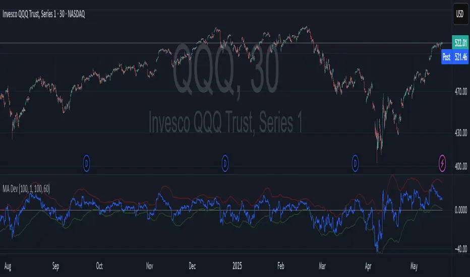 This indicator visualizes the deviation of price from its exponential moving average (EMA) and scales it within dynamic upper and lower bounds. The core logic measures the smoothed spread between price and EMA, then calculates standard deviation over a rolling window to define statistical thresholds.