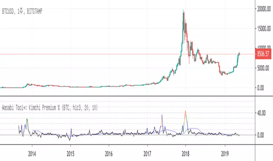This indicator is to show the Korean premium for crypto currencies in percent also well known as "Kimchi Premium" where crypto currencies at Korean exchanges are sometimes traded at a much higher price than those at other foreign exchanges probably due to several reasons including, but not limited to, scarcity of crypto assets compared to the unexpected exuberant local demand.
