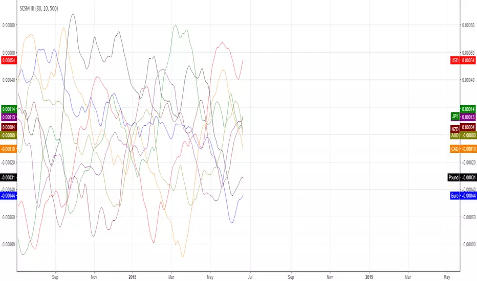 This is an updated version to the Currency Strength Measurer I created before. I'm not updating that script due to differences in the features and in the idea. The original script was a lagging indicator, I hope that this one is more of a leading indicator, the idea is the same. This indicator has way fewer inputs and it's more lightweight. Try it and compare it with the original SCSM and choose whichever suits your strategy best.