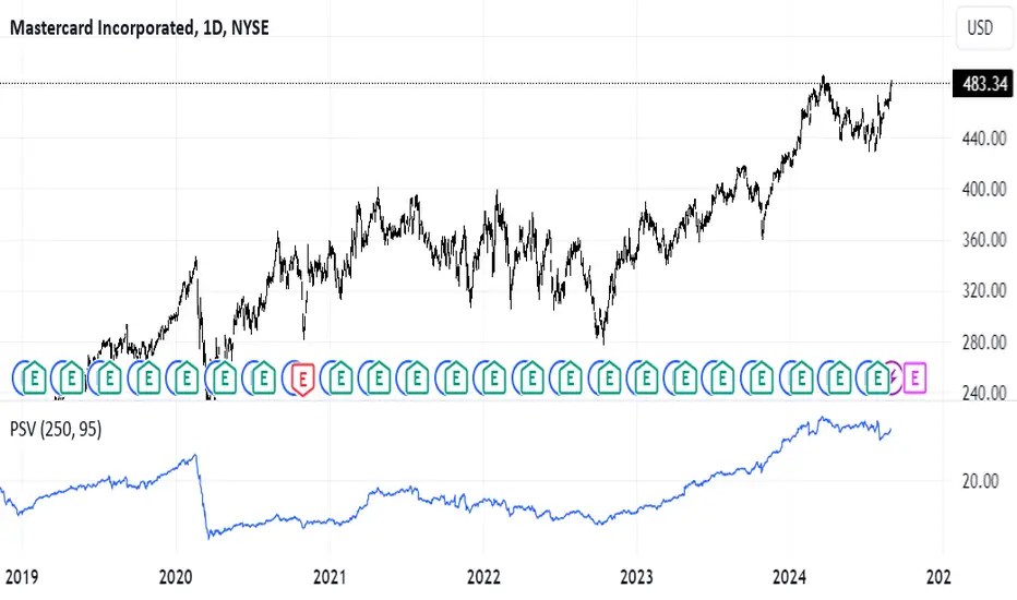 The **Position Sizer by Volatility (PSV)** is an indicator that helps traders determine what percentage of their deposit a position will occupy, taking into account the current market volatility. PSV calculates the range of price movements over recent periods and shows how large this movement is compared to historical data. The lower the value, the lower the volatility, and the smaller the stop-loss required relative to the current price.