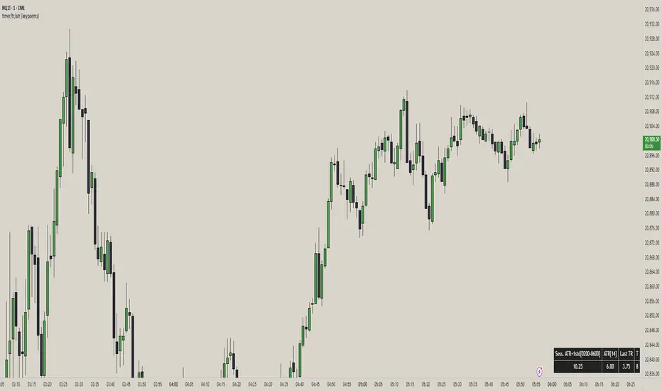 - Ticker line – Sess. ATR +1Stdev | Current ATR | Previous TR | 🕒 Time-left-in-bar |