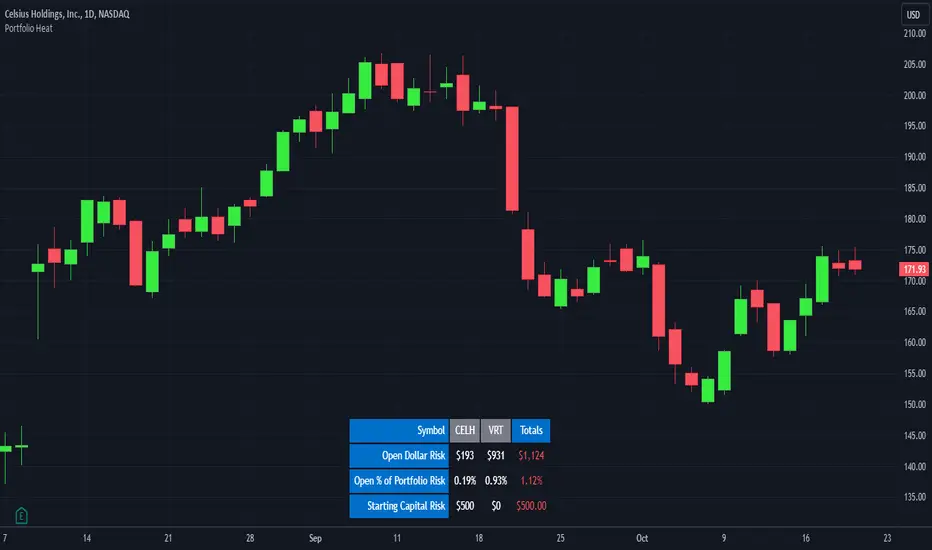 The "Portfolio Heat" indicator offers a visual representation of potential risk exposure for a portfolio across up to eight different symbols. It dynamically calculates three risk metrics based on current price, the number of shares owned, your designated stop loss, and total account size.