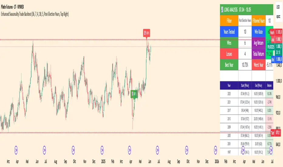 A comprehensive Pine Script indicator that backtests seasonal trading strategies by analyzing historical price performance during specific date ranges. The tool provides detailed statistics, visual markers, and election cycle filtering to identify profitable seasonal patterns.