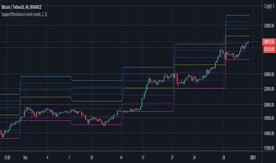 This script will show lines of support/resistance in each period you set (default is 1week). It shows 6 levels with the difference you can set too (default is 5%). The reason why I set default as 5% because as I notice the market will get bounced when it reach 5% up/down and hold that level for some time before it start moving up/down again. Hope this script will help you decide whether it's time to buy/sell when it reached the levels. Thank you.