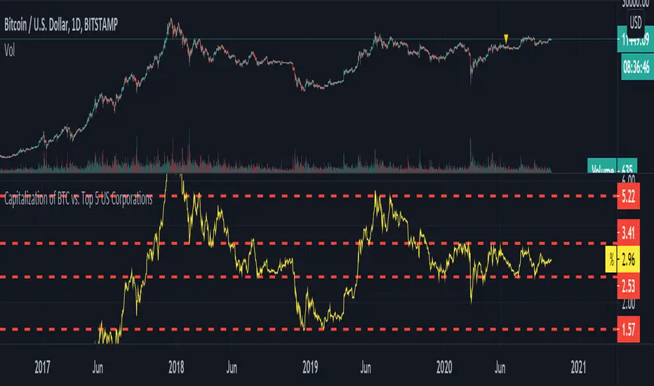 This script displays the capitalization of Bitcoin as a percentage of the capitalization of 5 large US corporations: Apple, Microsoft, Amazon, Google, Facebook. According to tradingview.com/markets/stocks-usa/market-movers-large-cap/ these are (at the current time) the largest US companies.