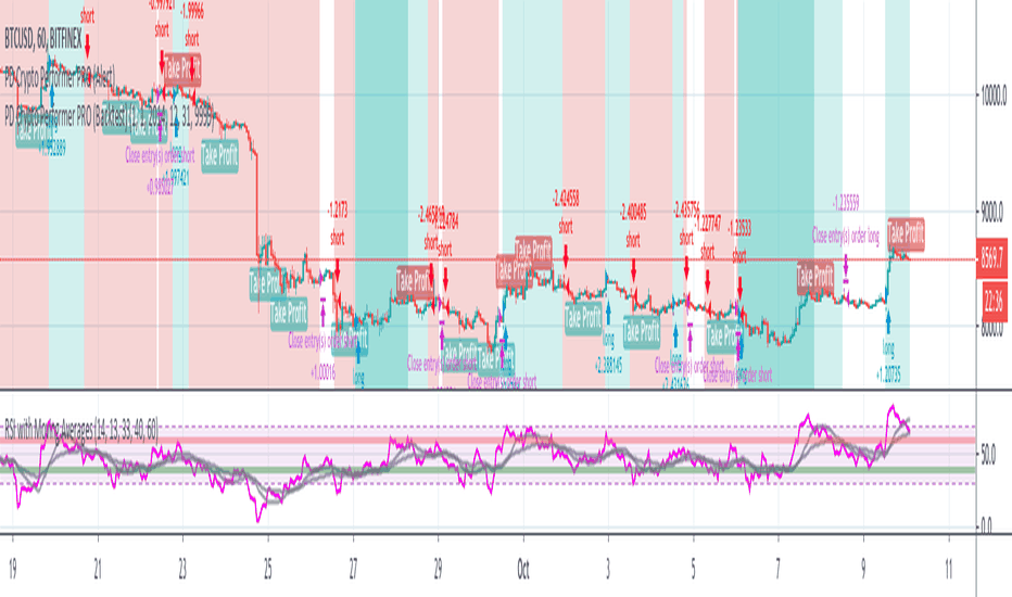 This indicator includes two strategies for crypto assets, a trend-identifying swing strategy and a low risk scalping strategy. For decision making, the Performer strategy mainly uses smoothed Simple Moving Averages (SMA) and divergences in Relative Strength Index (RSI), Moving Average Convergence Divergence (MACD), and histogram. A leading indicator (eg. BTCUSD for crypto) is also used for more accurate and timely market identification.