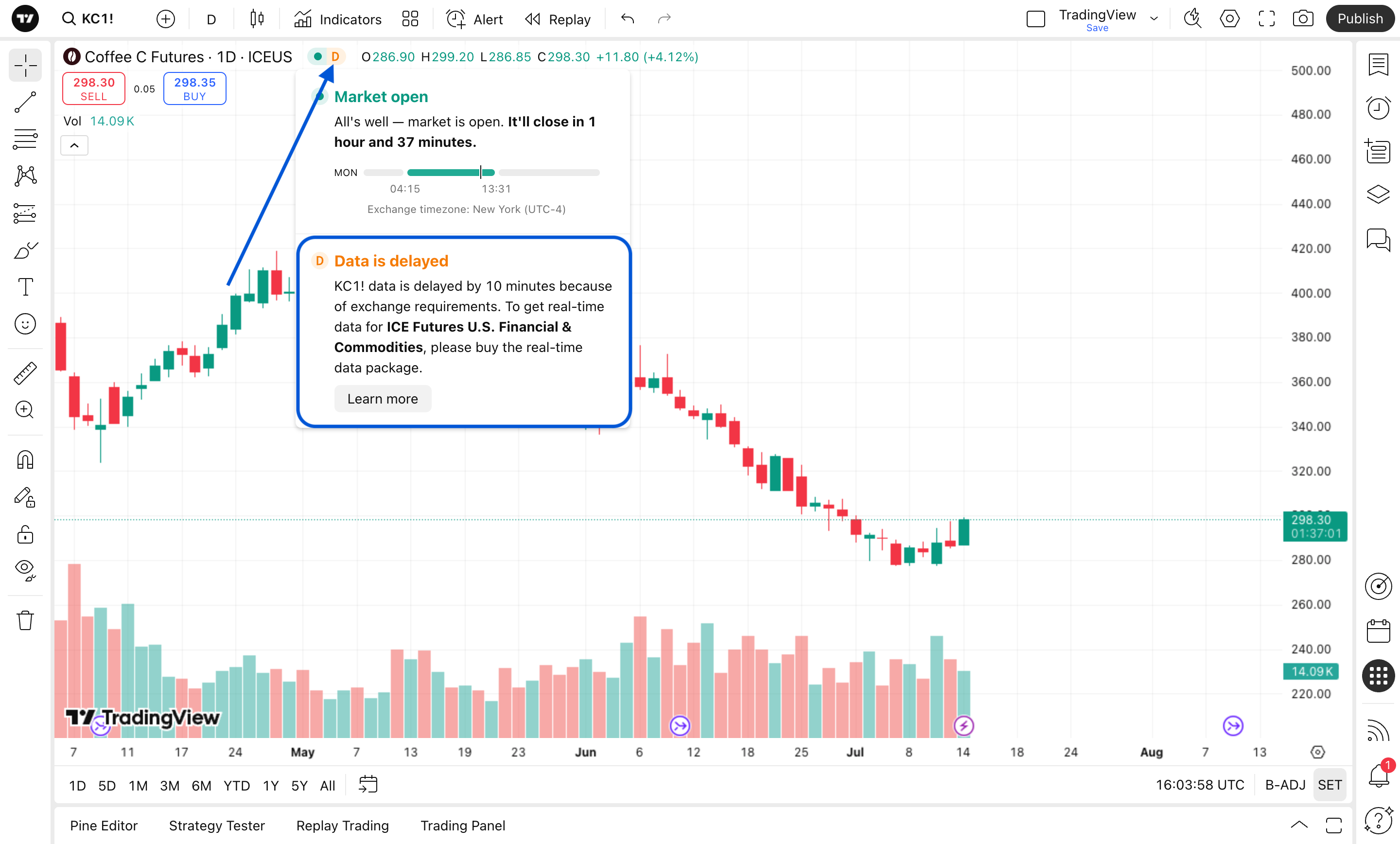 在超級圖表中,如果您在圖表狀態列中看到「數據延遲」訊息,請點擊「了解更多」按鈕購買即時數據。