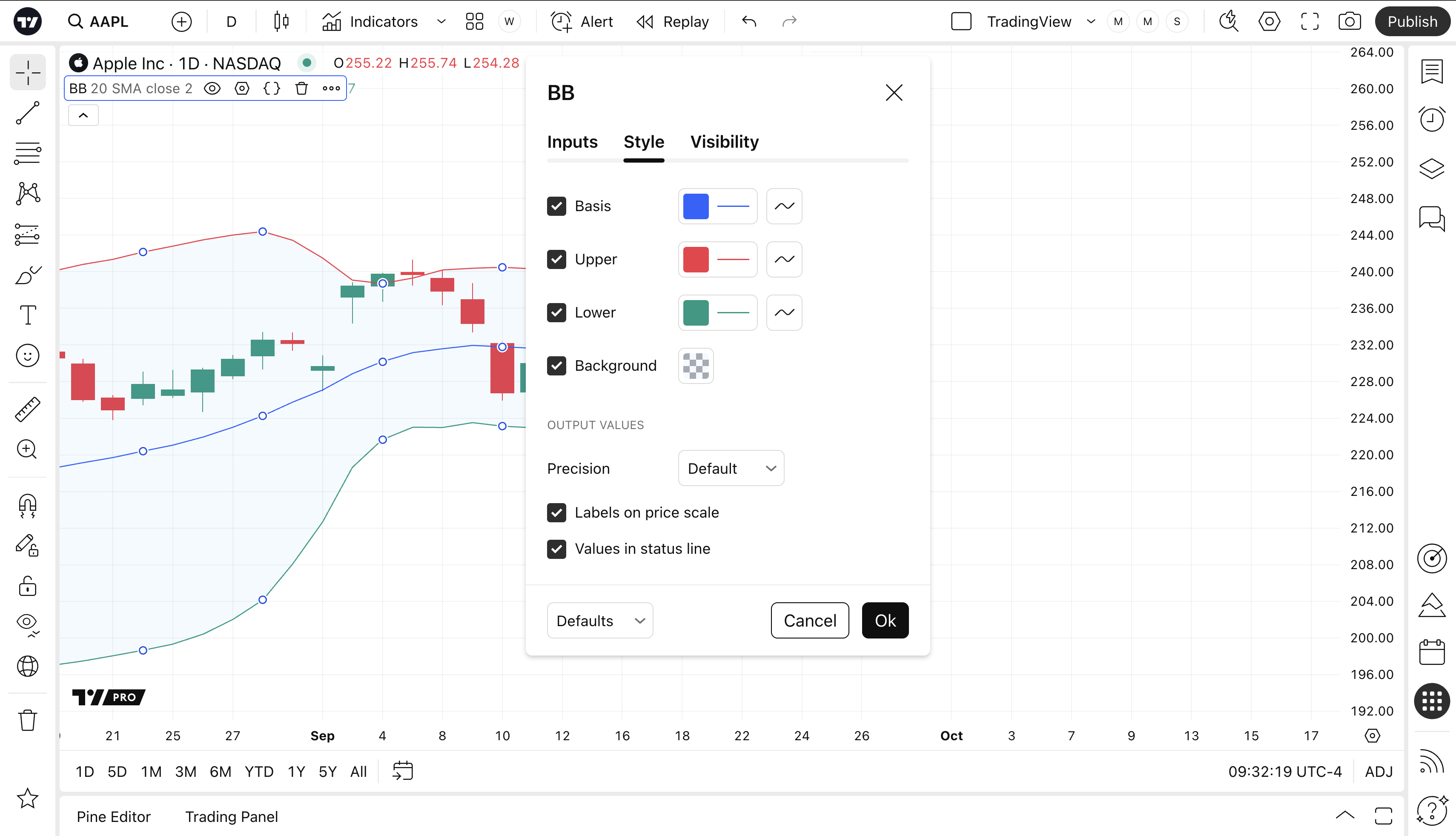 可以切換下軌的可見性,以及顯示下軌實際當前價格的價格線可見性。也可以選擇下軌的顏色、線條粗細和線條樣式。