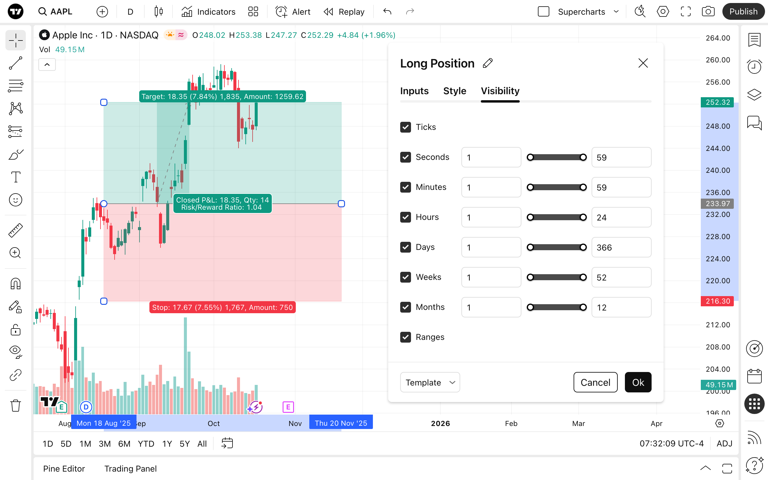 在可見性屬性對話方塊中,您可以在不同時間範圍的圖表上切換多頭部位的顯示。對於任何時間範圍,您可以選擇顯示或隱藏。