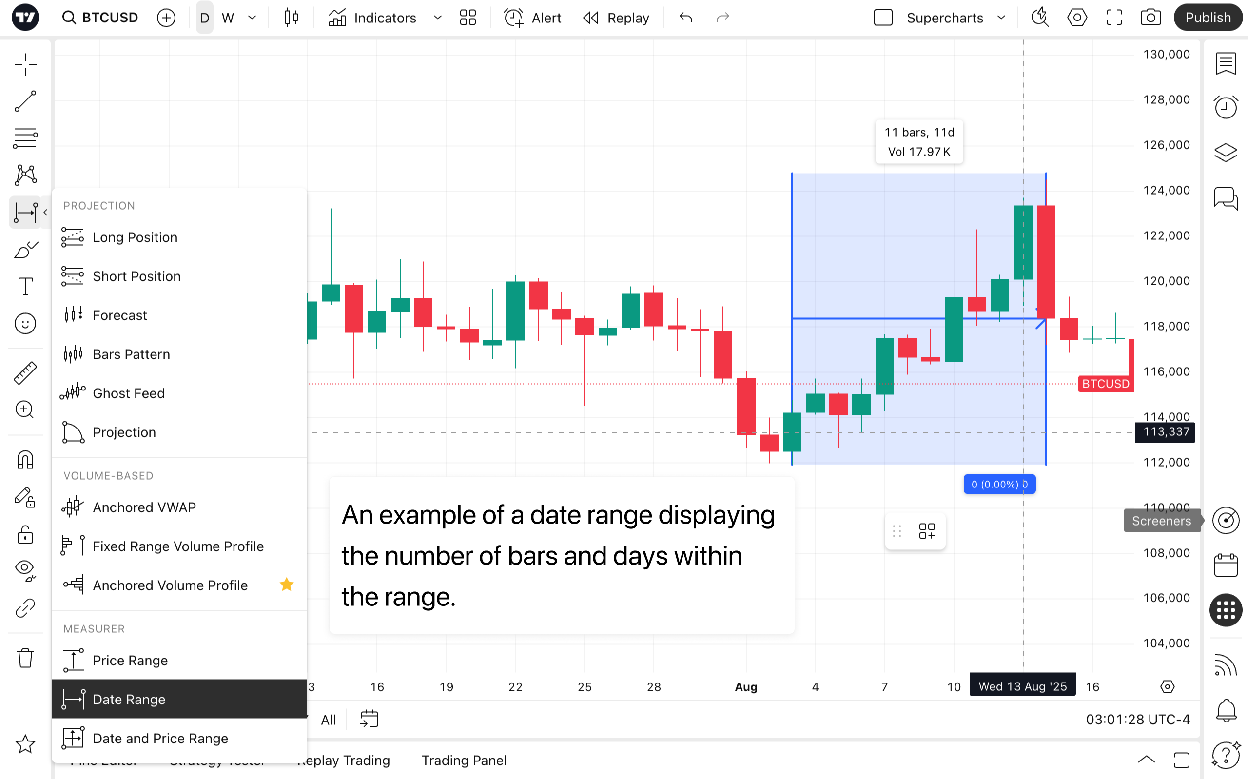 該工具允許使用者將點水平放置在兩個不同的時間點上。然後,所選點之間將出現一個陰影框,顯示日期範圍(或日內週期的時間範圍)。文字也會出現在顯示K線數,以及日期/時間週期內經過的時間方塊中。