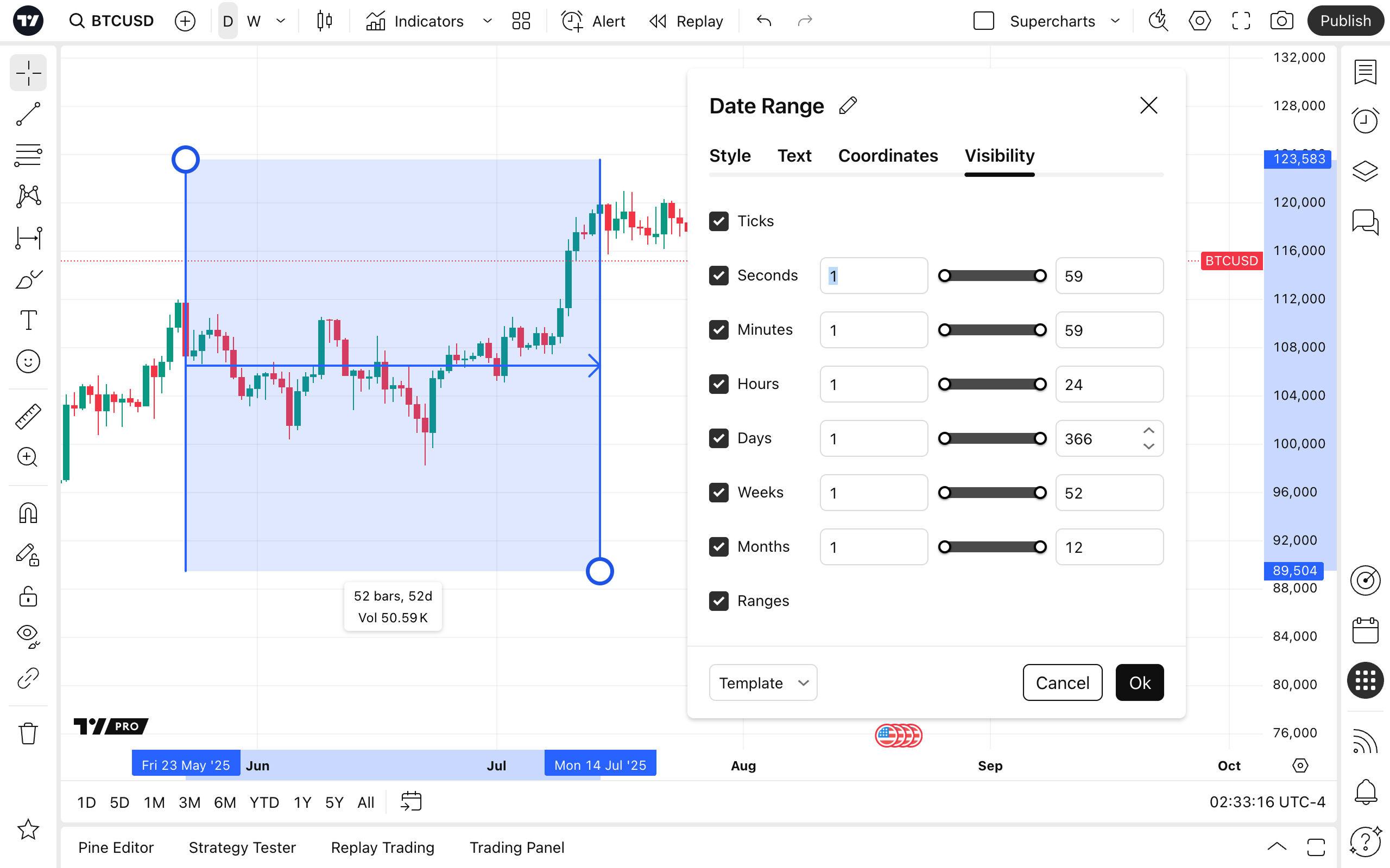 在可見性屬性對話方塊中,您可以切換不同時間週期圖表上顯示的日期範圍: