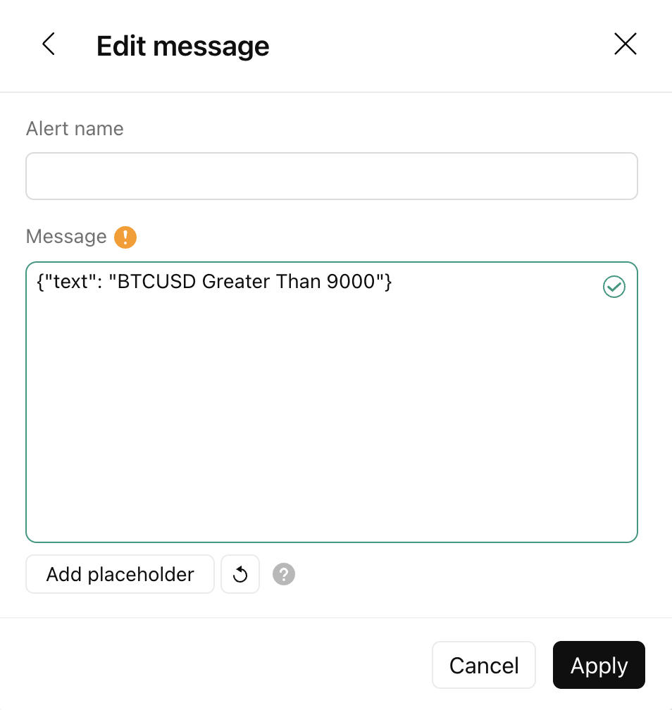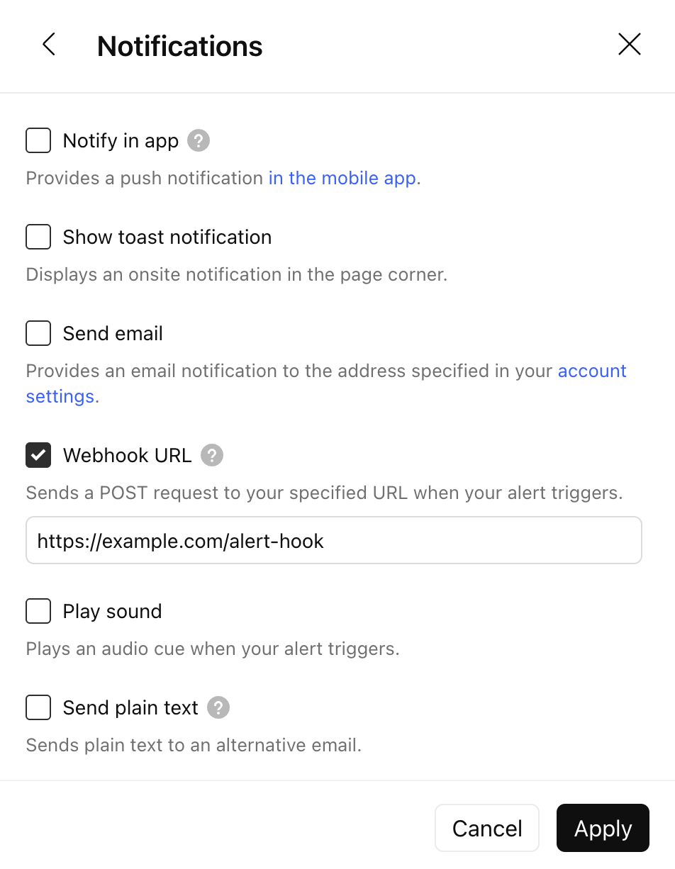 curl -H 'Content-Type: text/plain; charset=utf-8' -d 'BTCUSD Greater Than 9000' -X POST https://webhook.site/test為了保護您的數據,僅在啟用雙重因素身分驗證的情況下,才允許使用快訊Webhooks。