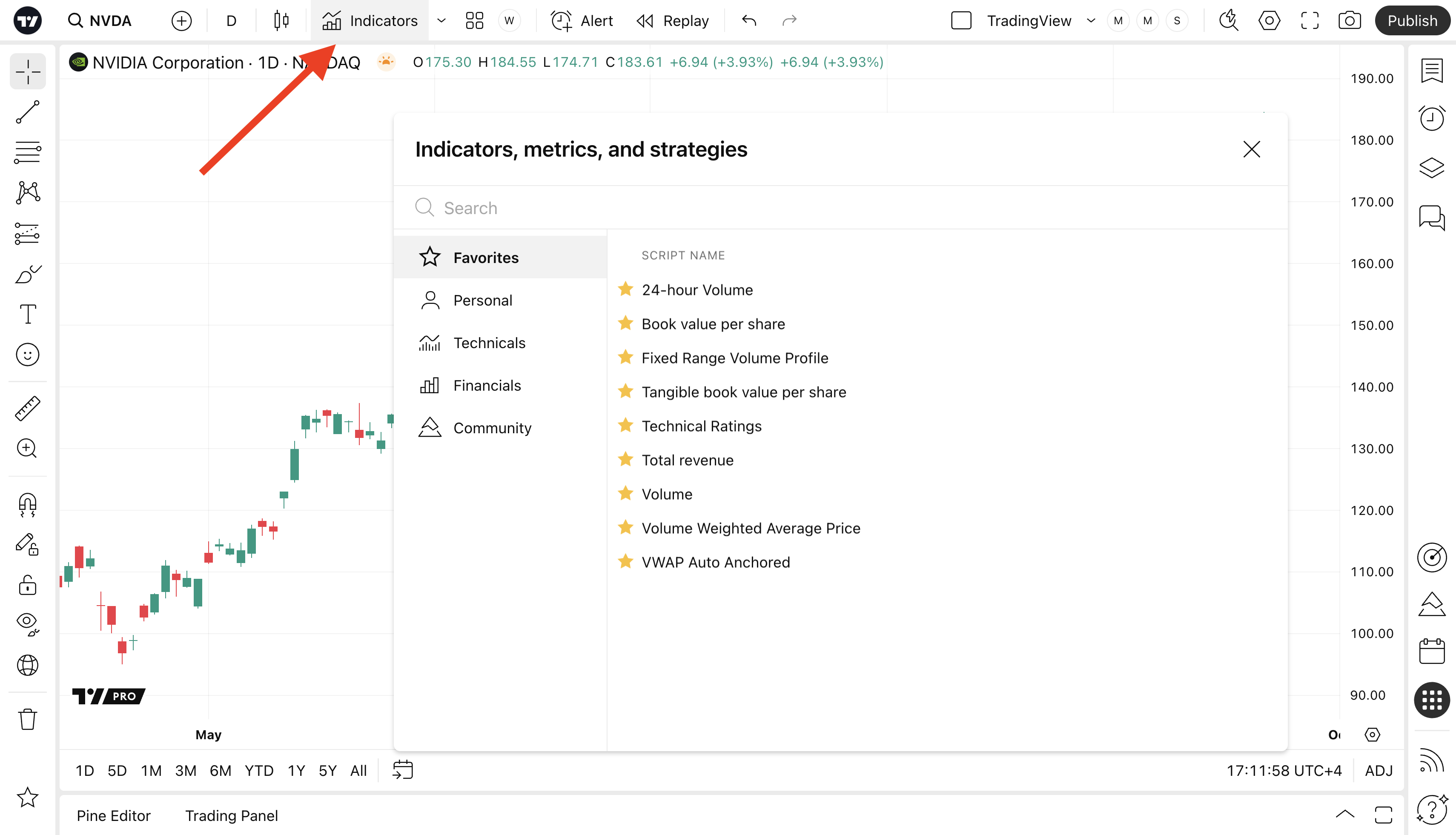 TradingView內建了數百種指標和策略,此外還有超過 10 萬個由社群創建的指標。你可以在指標選單中找到它們,讓我們來看看裡面還有什麼內容。