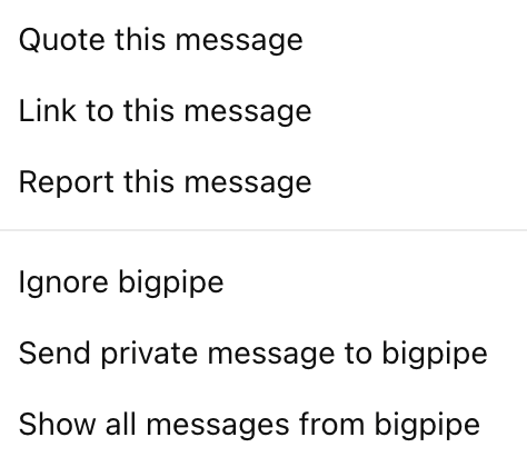 如果您不想看到某個特定用戶的訊息,則可以選擇忽略該用戶。 - 發送私密訊息給該用戶: