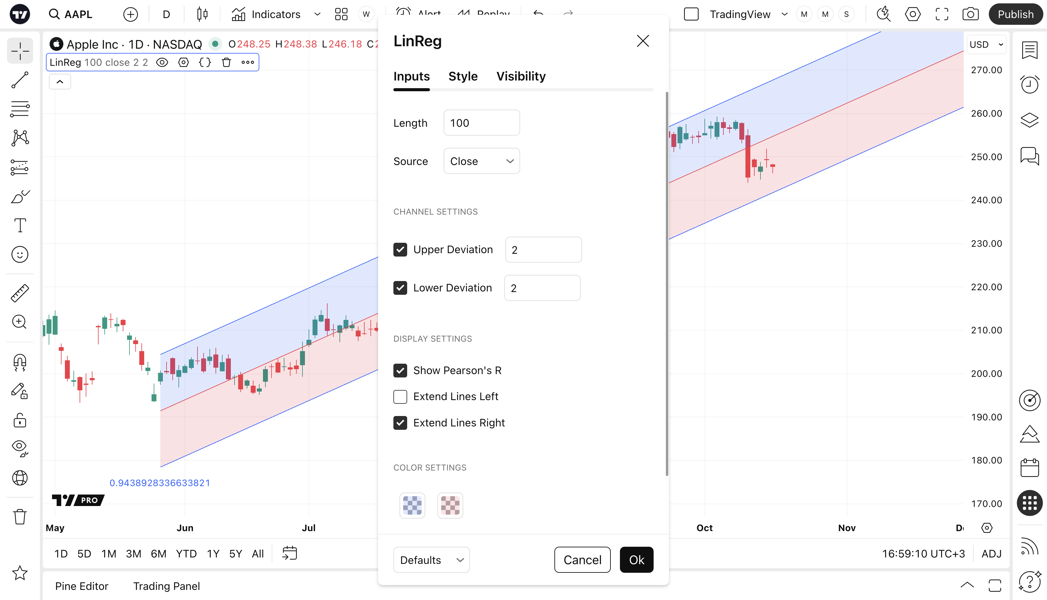 線性回歸指標基於線性回歸計算可視化圖表特定部分的總體價格趨勢。指標的中心線是線性回歸計算本身,其上方或下方的線是從主要標準差中移除的X個標準差。這是一個很好的工具,可用於確定價格何時異常遠離其基線。