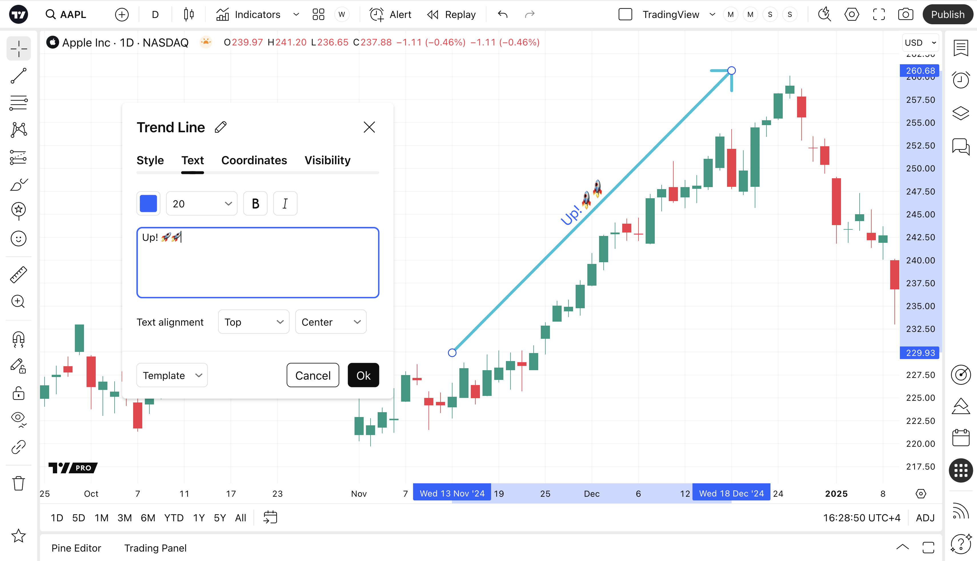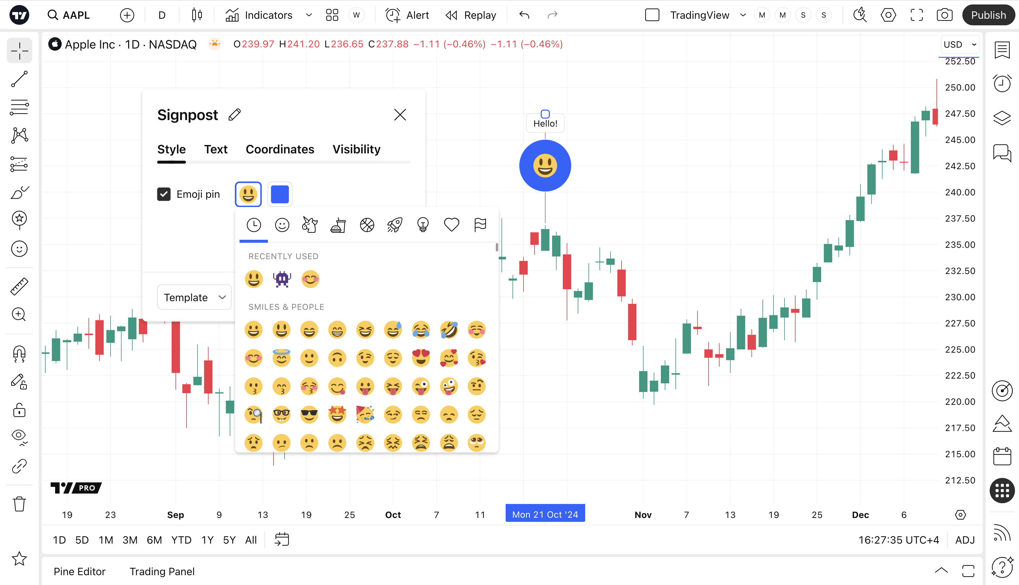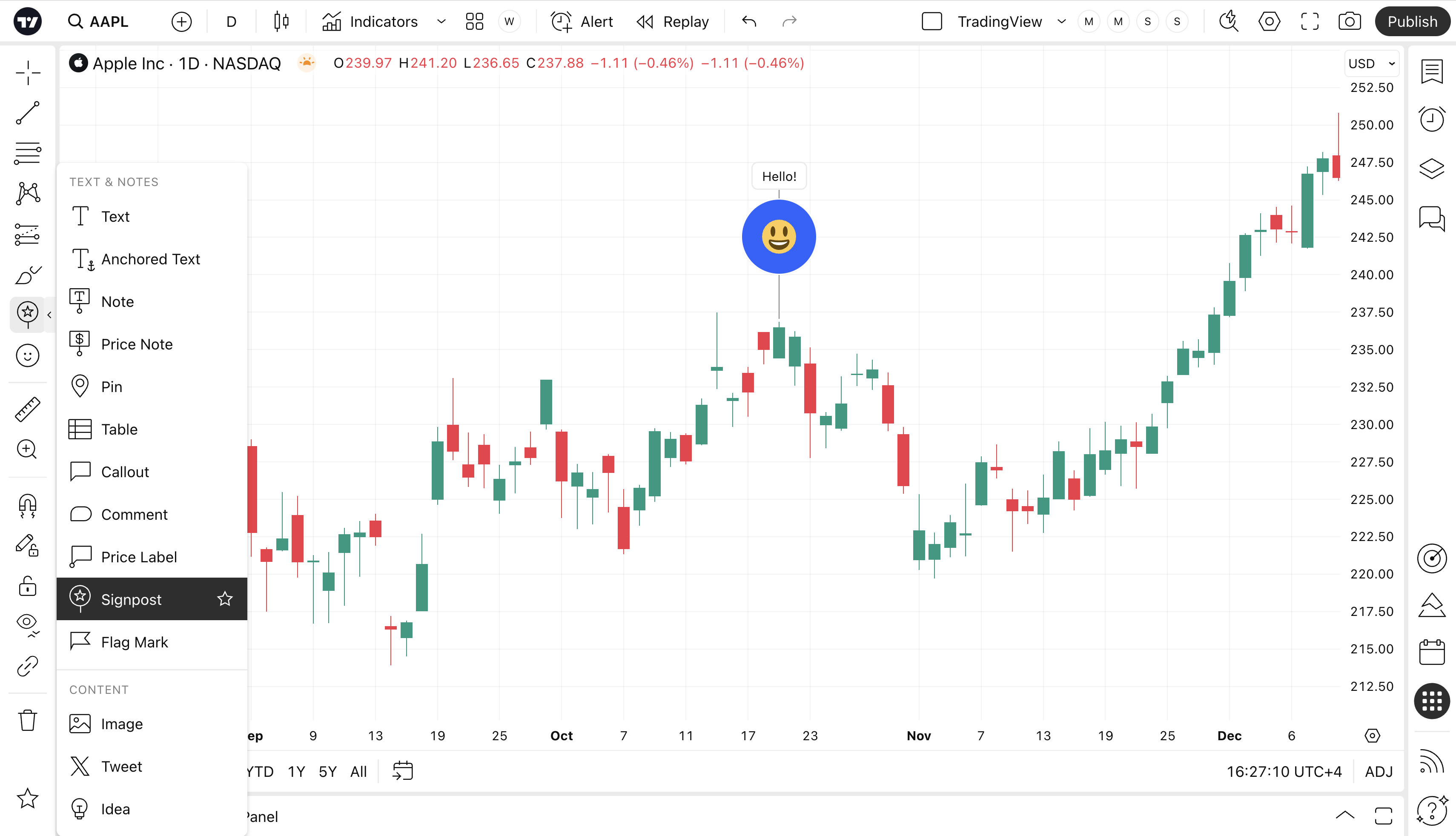 將表情符號新增至圖表的另一種方法是指示牌工具,該工具位於「註釋工具」標籤上。