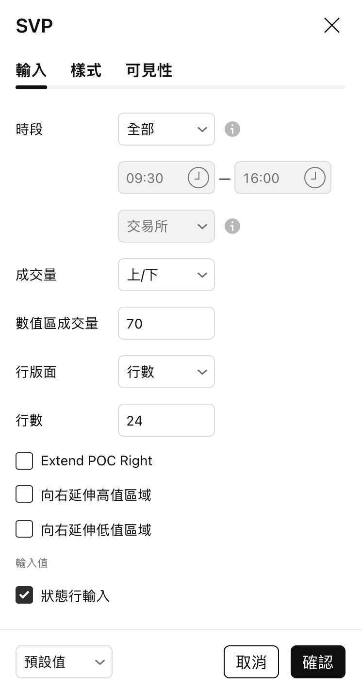 指定價值區域應突顯交易時段所有成交量的百分比。