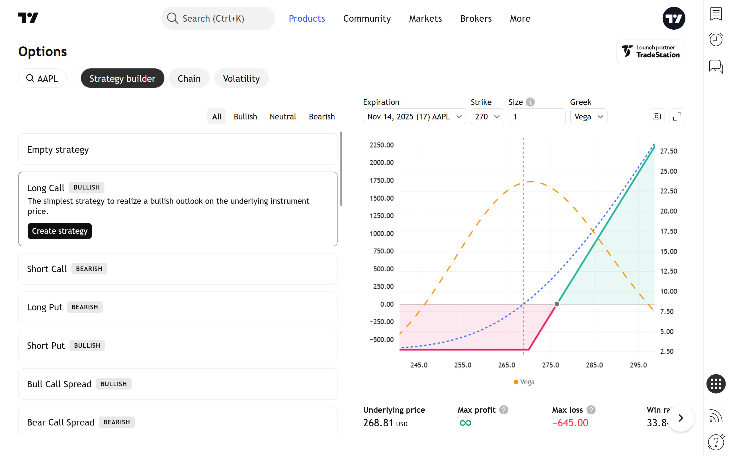 系統會預設選擇商品,並啟動最簡單的期權策略 — 買權多單。此檢視的目的是讓您探索標準策略,並將它們作為策略建模的起點。