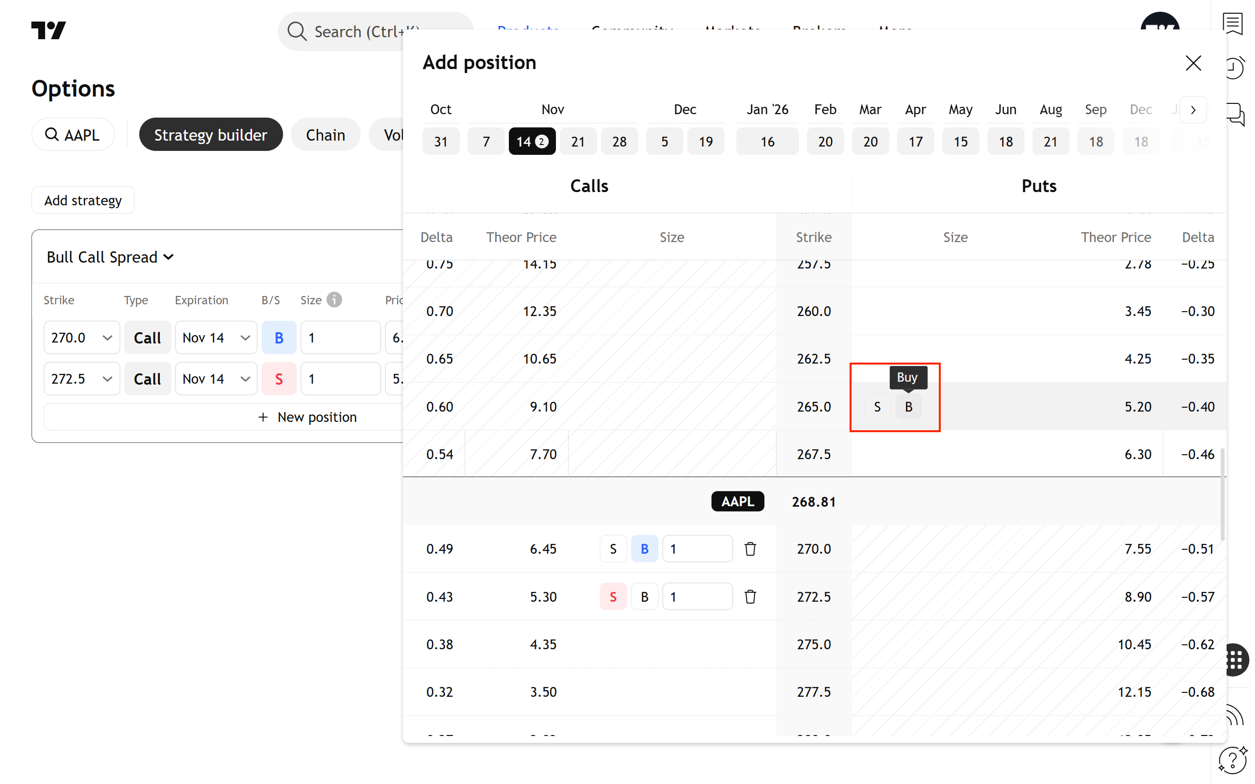 要新增倉位,將滑鼠移到想要的選擇權上方,會出現帶有B(買)和S(賣)按鈕的控制面板。