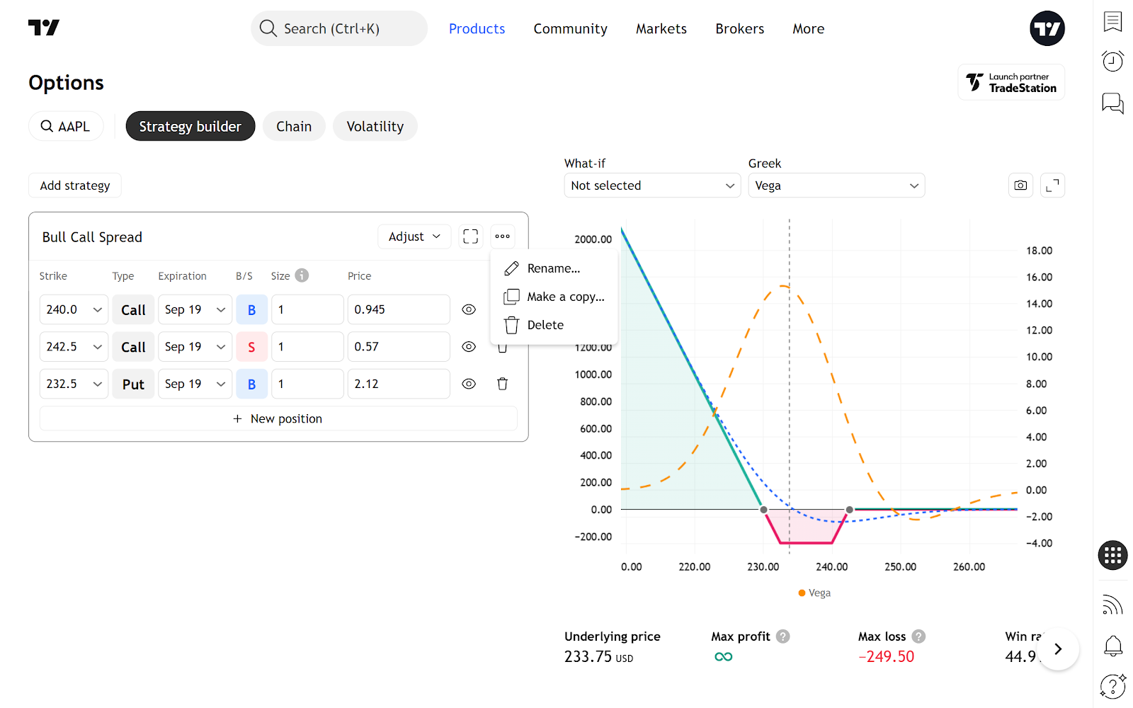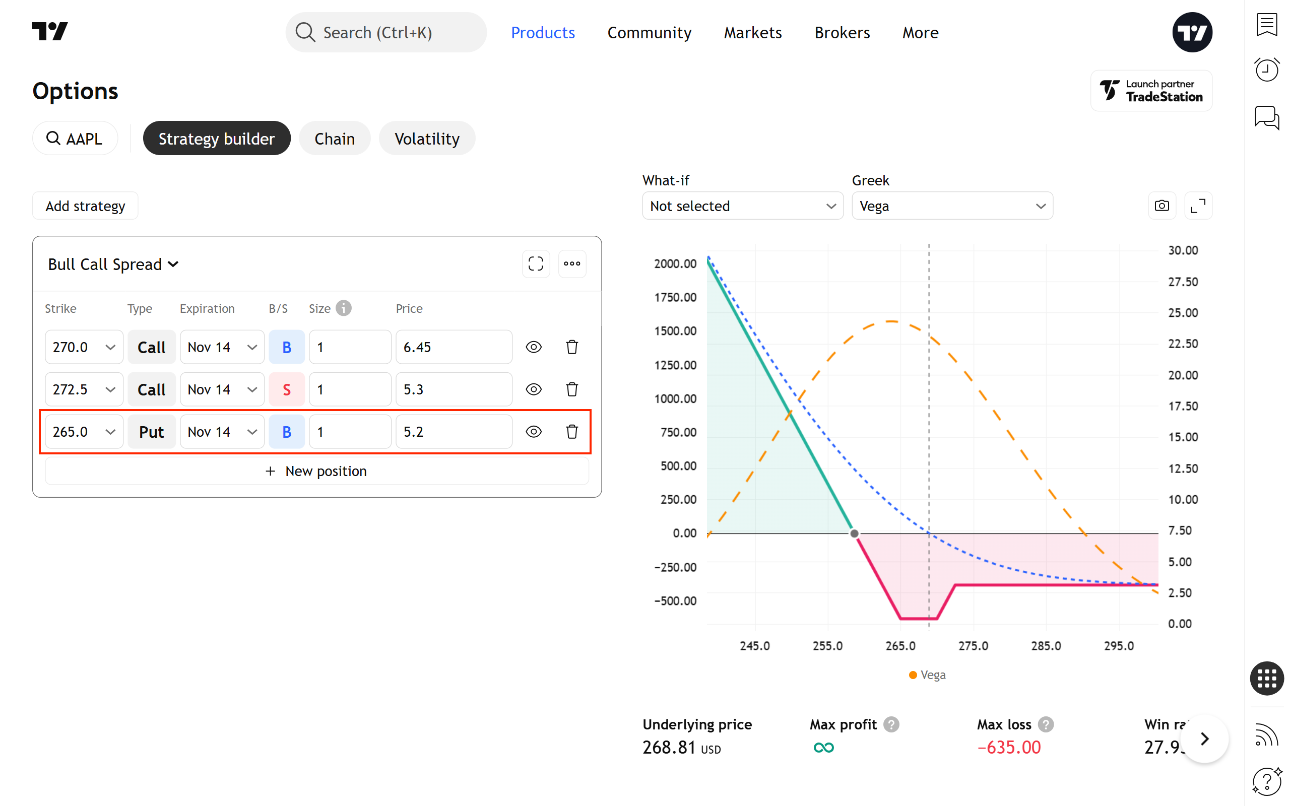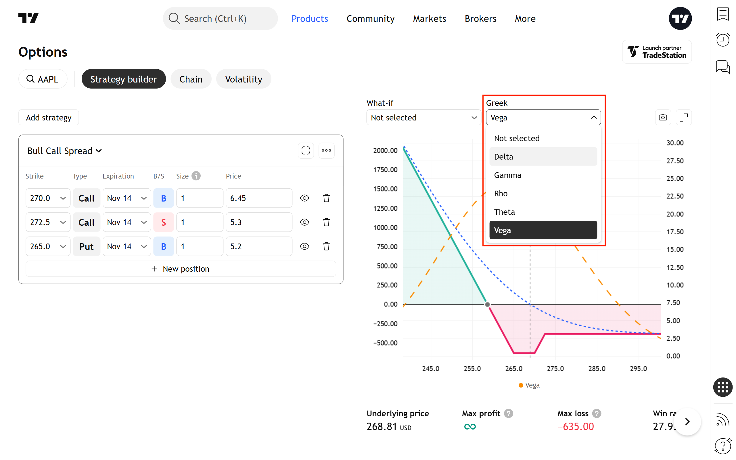 您可以使用圖表上方的控制項修改這個虛擬策略 — 變更到期日、行使價、倉位大小及其他參數。