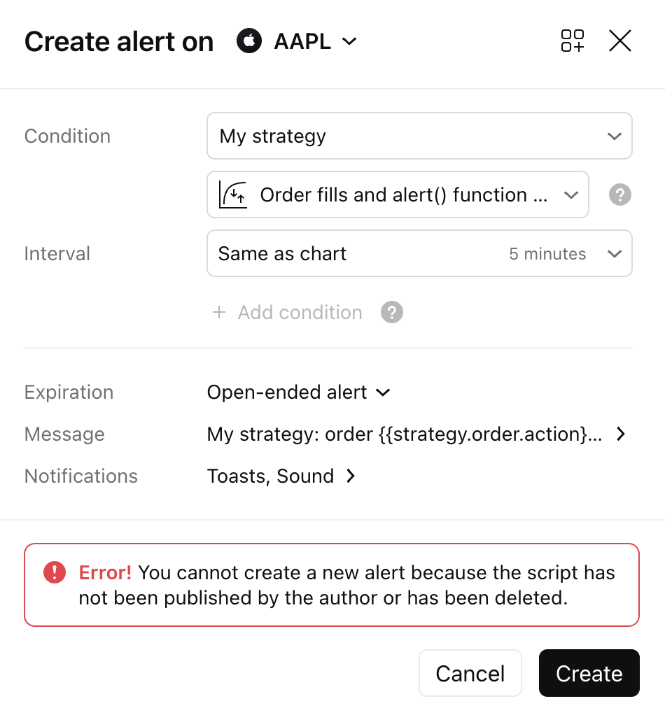 1. 您正在嘗試針對其他使用者的腳本建立快訊,但該腳本尚未由作者發佈。在這種情況下,您也無法查看該腳本的原始程式碼。